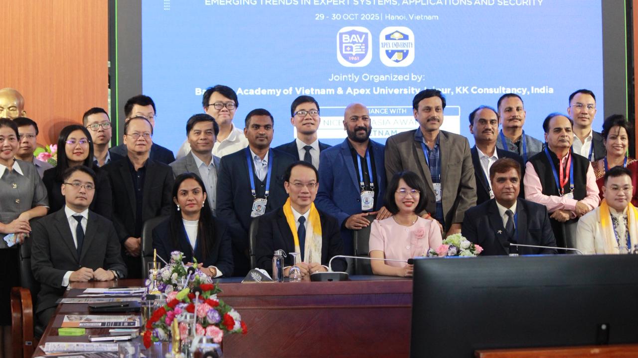 The prestigious international event was jointly organized by the Banking Academy of Vietnam and Apex University, Jaipur, and managed by KK Consultancy Services India (KKCS India). The conference brought together delegates from more than 30 countries, including Vietnam, India, Philippines, Singapore, Thailand, Korea, China, Taiwan, Serbia, Italy, USA, and the UK—marking a major milestone in international academic cooperation.